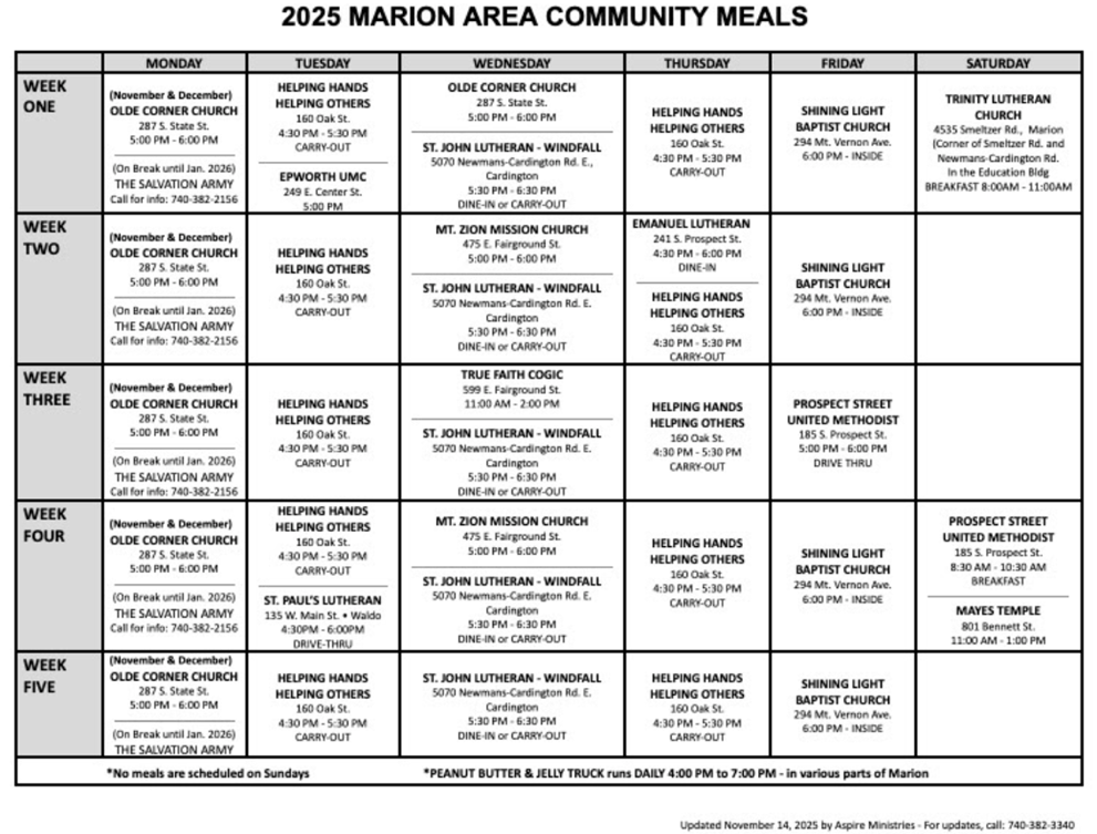 Marion Area COMMUNITY MEALS Calendar (updated 11-14-2025)
