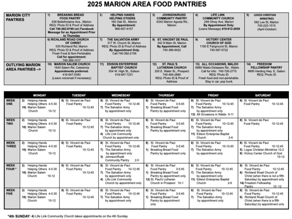 Marion Area FOOD PANTRIES Calendar (updated 11-14-2025)
